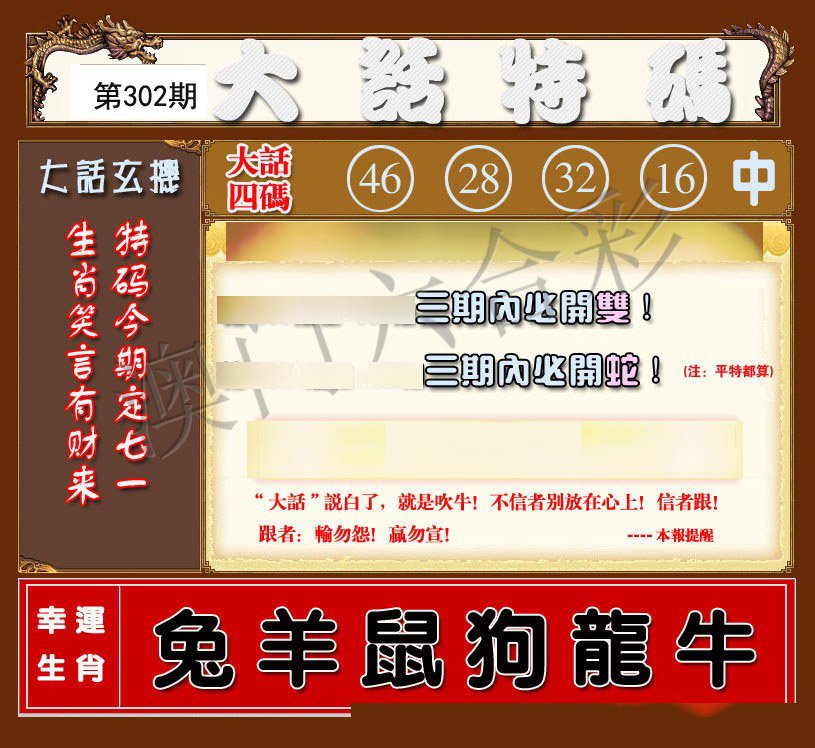 | 302期推荐⑤肖:虎猪鼠狗蛇 |