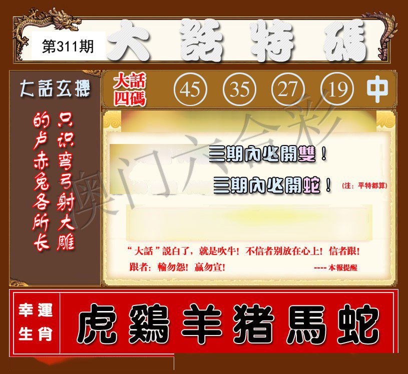 307期六尾中特『4 5 3 0 2 1尾』开:猴34 |