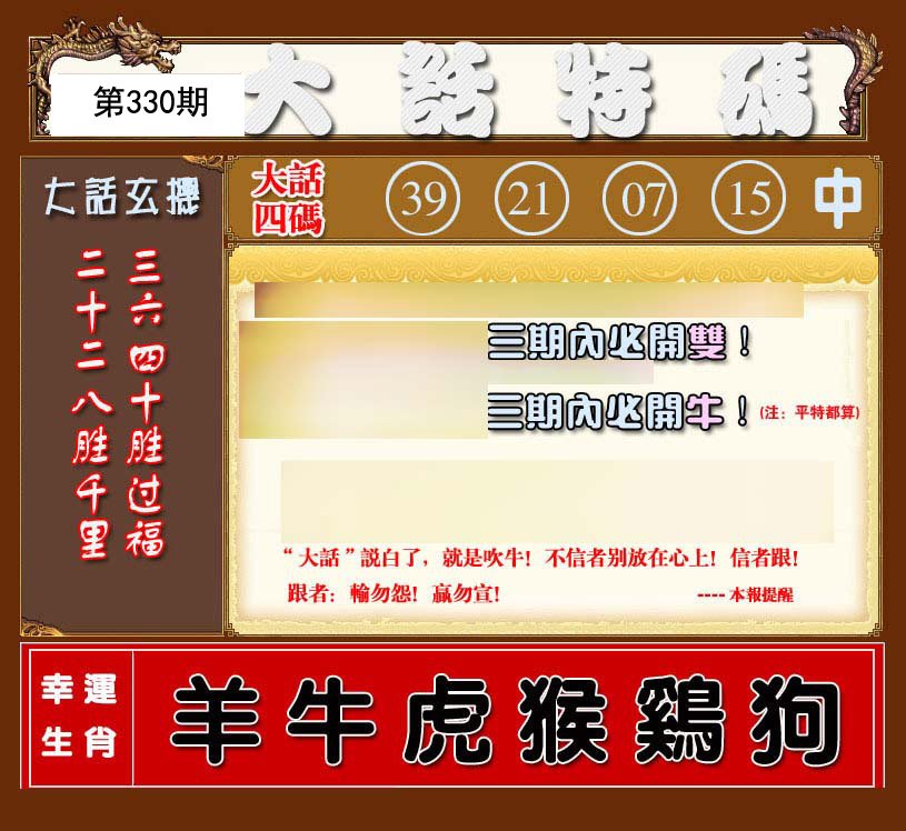 | 330期推荐⑤肖:虎牛马蛇龙 |
