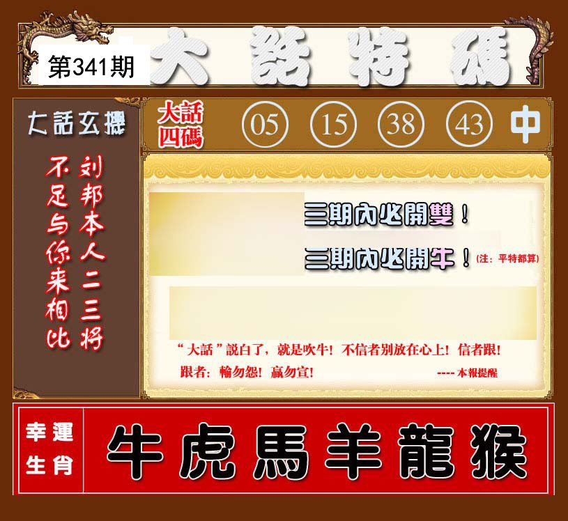 341期 平特一肖 『 龙龙龙 』 |